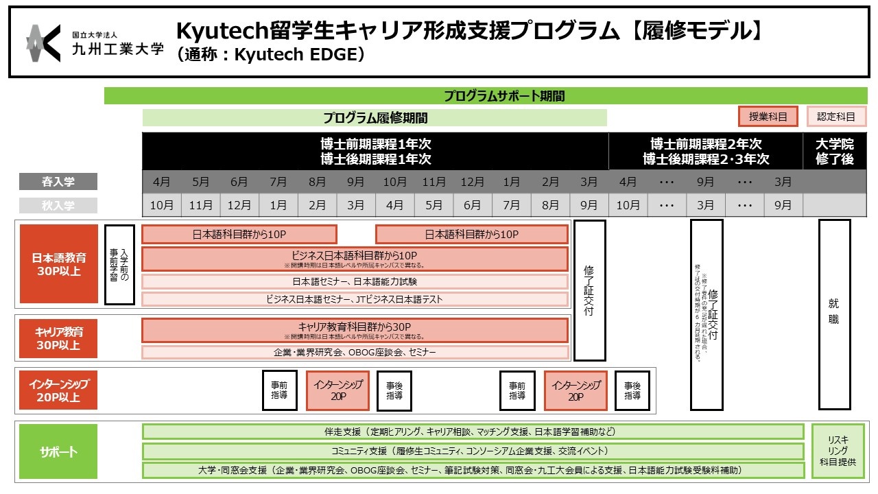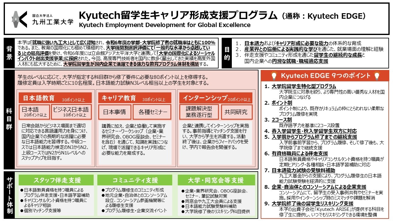九州工業大学の大学院留学生が、日本国内企業で就職し、産業界で活躍できるように「日本語教育」「キャリア教育」「インターンシップ」を主軸に構成する令和8年度から開始の正課外教育プログラムです。