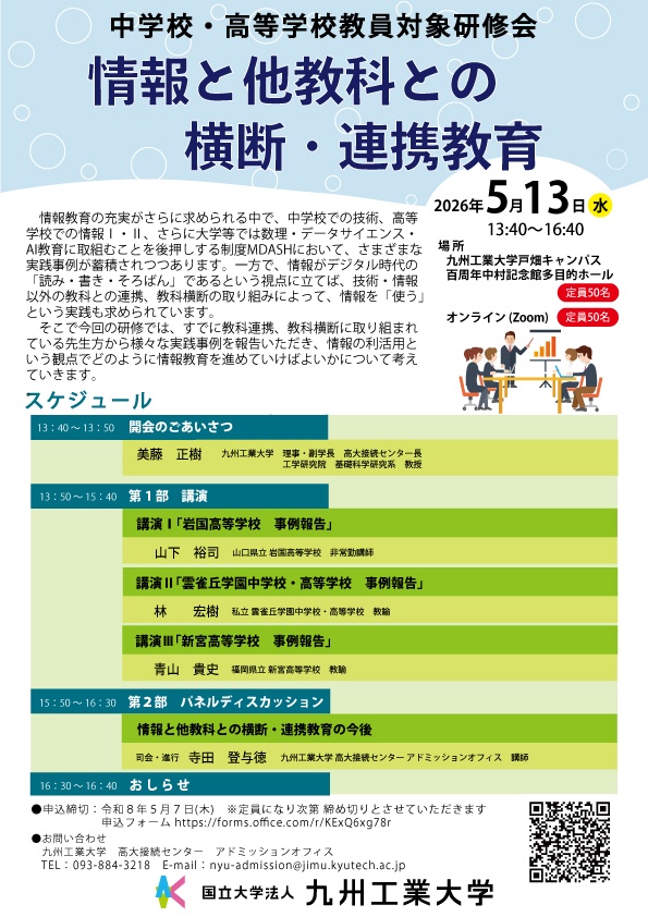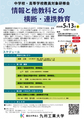 そこで、今回の研修では九州工業大学の情報科教育法等を担当する教員と本学で数理・データサイエンス・AI教育プログラムを担当する教員、そして高校で実際に情報を指導されている先生の3名からお話を伺い、高大接続という観点でどのように情報教育を進めていけば良いかについて考えていきます。