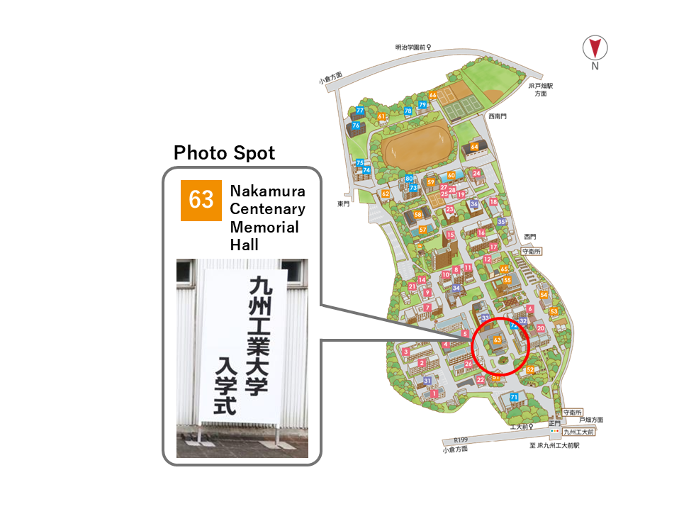 On the day of the Commencement Ceremony, we will place Commemorative Commencement Ceremony Signs at four locations: two at the north entrance and two at the south entrance of Nakamura Centenary Memorial Hall, Tobata Campus, Kyushu Institute of Technology (Building No. 63).