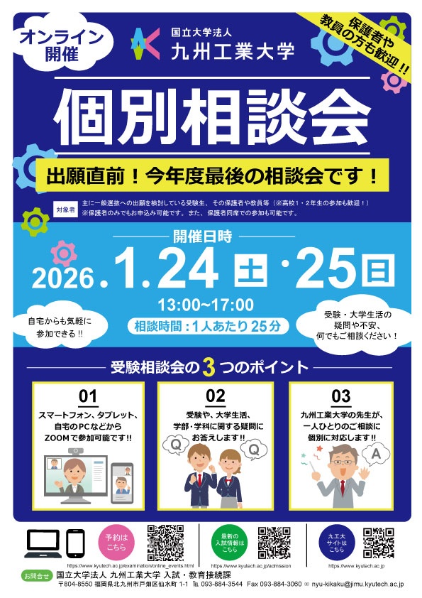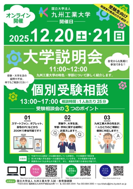 九州工業大学では、本学の進学を考えている受験生、保護者の皆さま、高等学校・予備校の教員の方々を対象に本学の教育・研究、入口、出口の現状を知っていただくことを目的とした「オンライン大学説明会・受験相談会」を開催いたします。・大学説明会では、九州工業大学の特色や学部の紹介及び入学者選抜等を詳しく説明します。