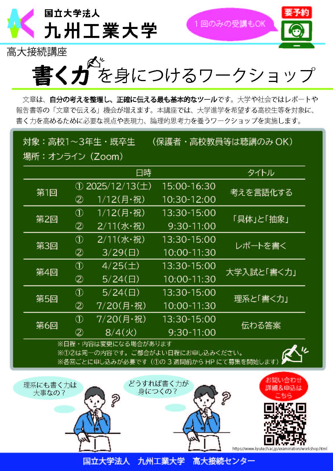 九州工業大学では、総合型選抜等への出願を検討している高校生・高卒生、保護者の皆さま、高等学校・中等教育学校などの担任・進路指導ご担当の方々を対象に、「書く力を身につけるワークショップ」を開催します。