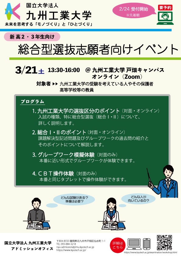 九州工業大学では、本学の学校推薦型選抜や総合型選抜等への出願を検討している高校生、保護者の皆さま、高等学校・中等教育学校などの担任・進路指導ご担当の方々を対象に、志願者向けオンラインイベントを実施します。多くの皆さんのご参加をお待ちしています。