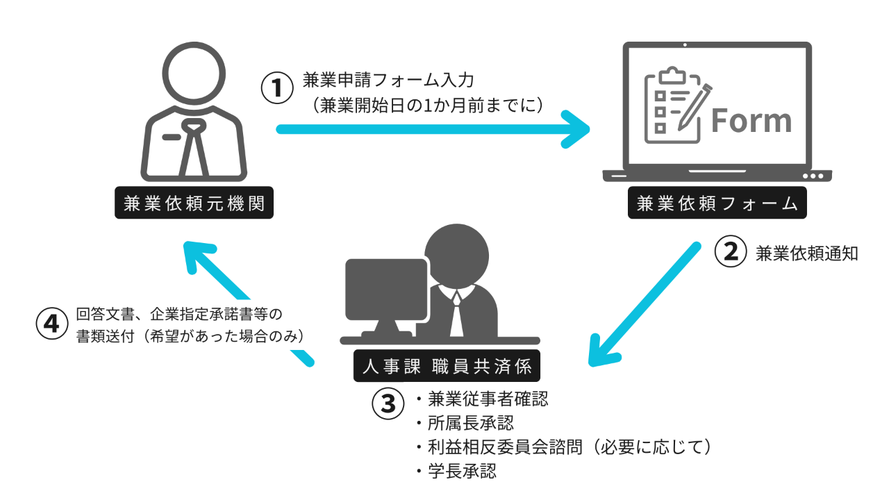 本学の教職員に兼業を依頼される場合は、以下の手順に沿って申請をお願いいたします。