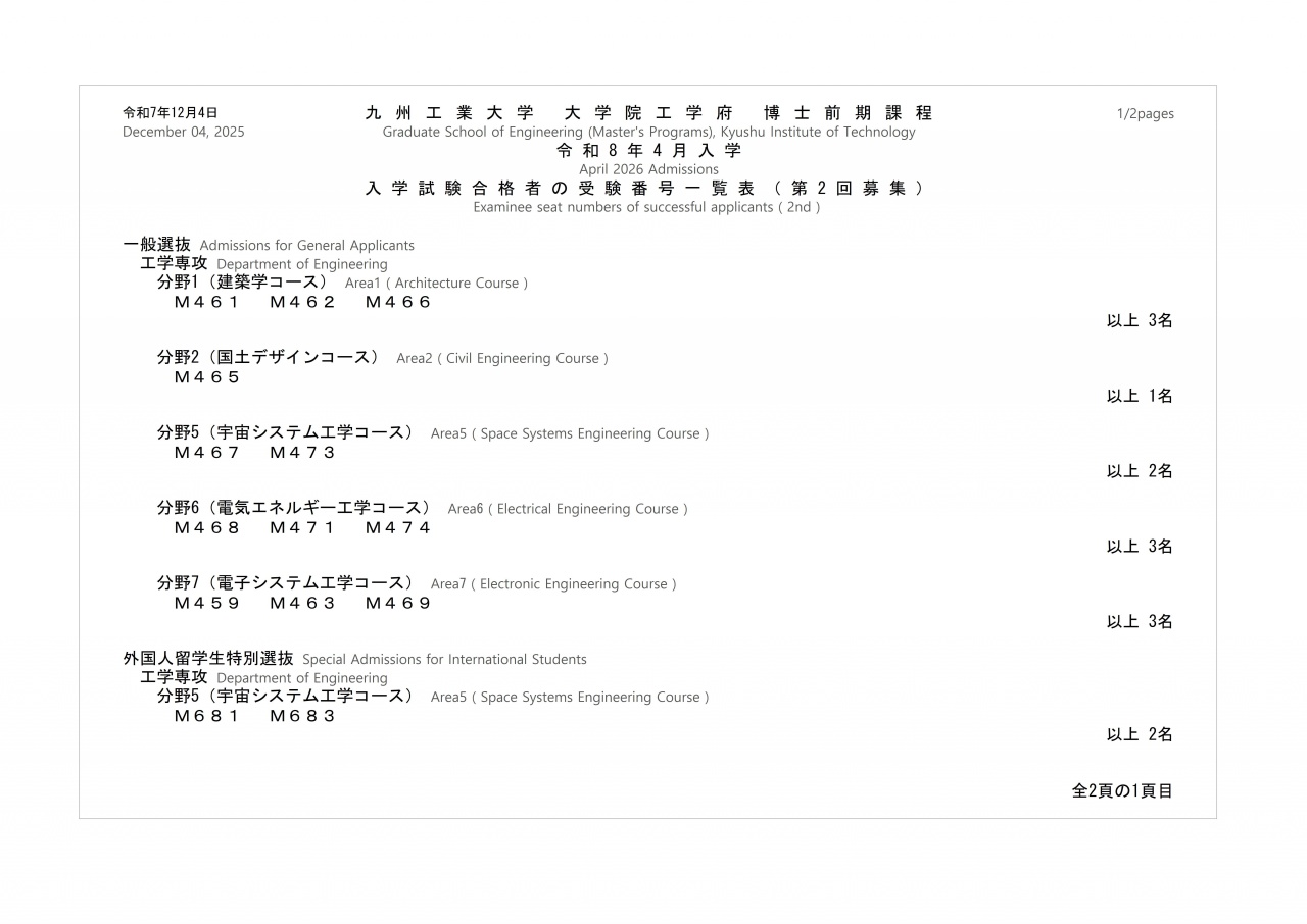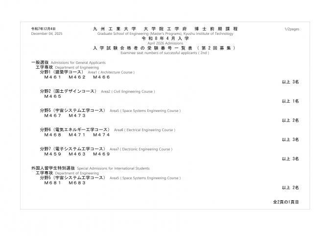 令和8年度大学院工学府博士課程合格者発表(博士前期課程)