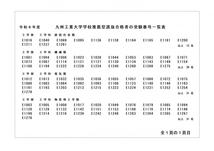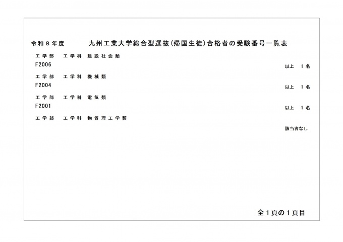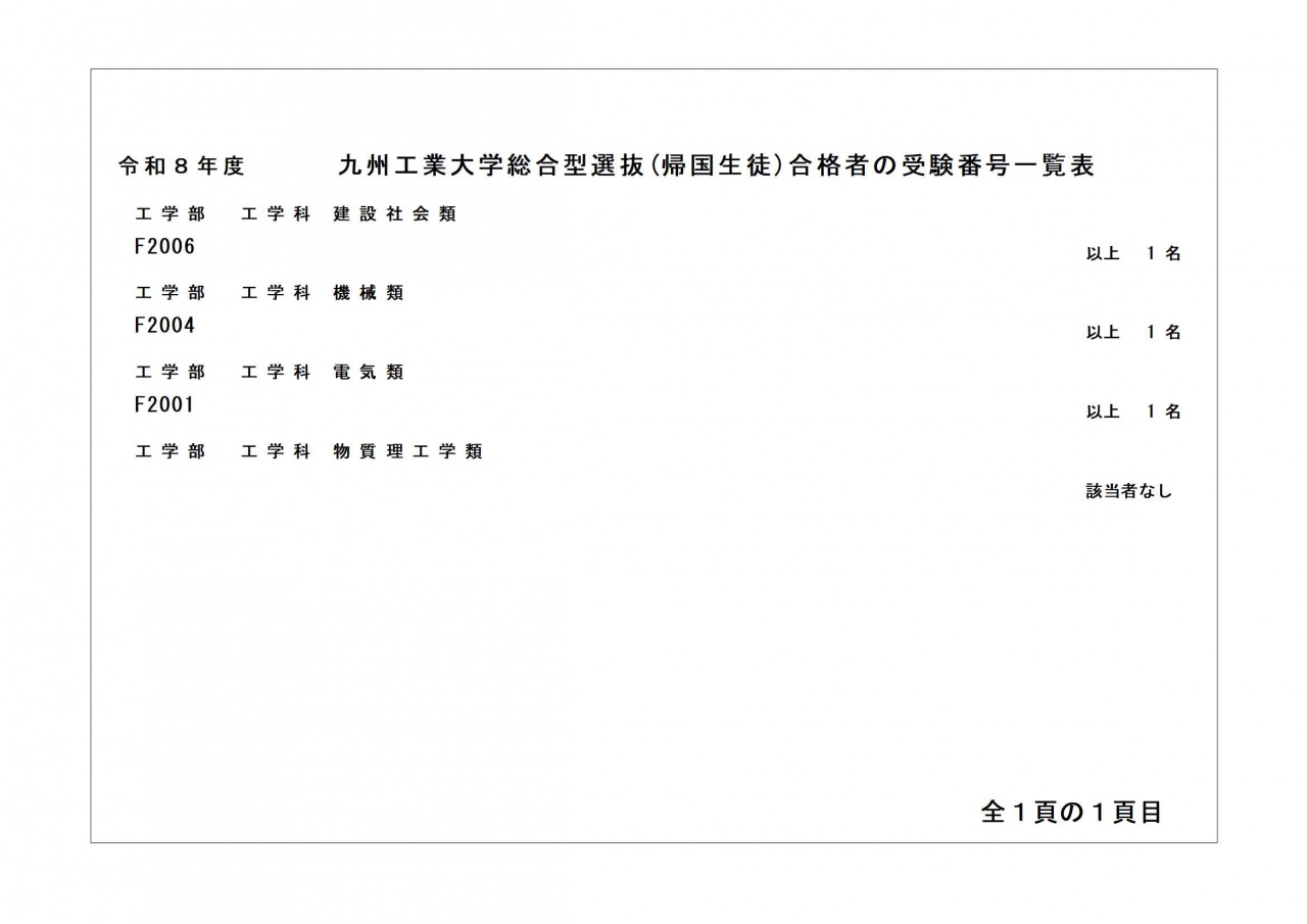 令和8年度学校推薦型選抜及び総合型選抜(帰国生徒)合格者発表[工学部]