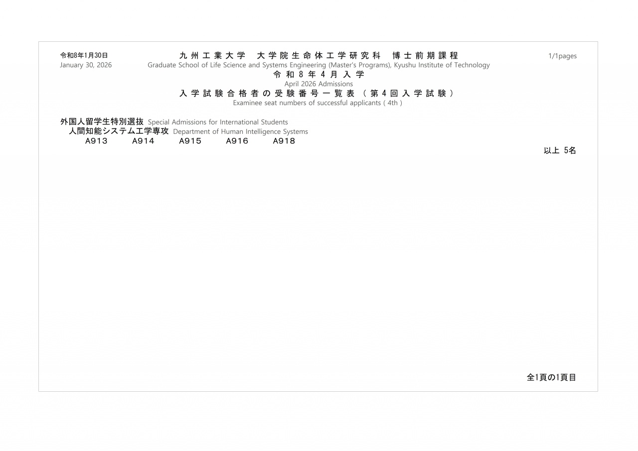 令和8年度大学院生命体工学研究科博士課程合格者発表(博士前期課程)