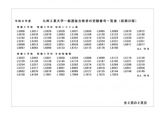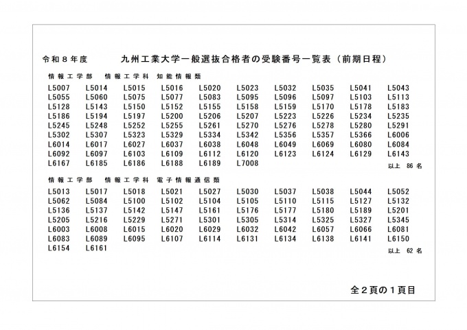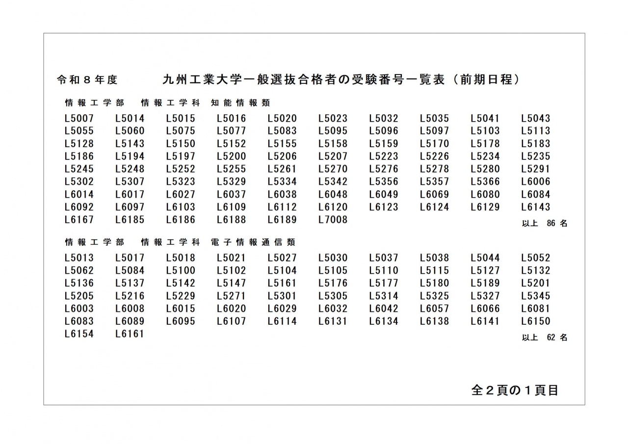 令和8年度一般選抜(前期日程)合格者発表[情報工学部]