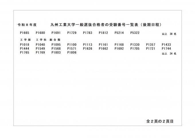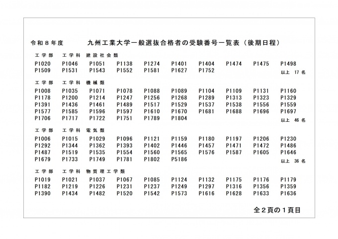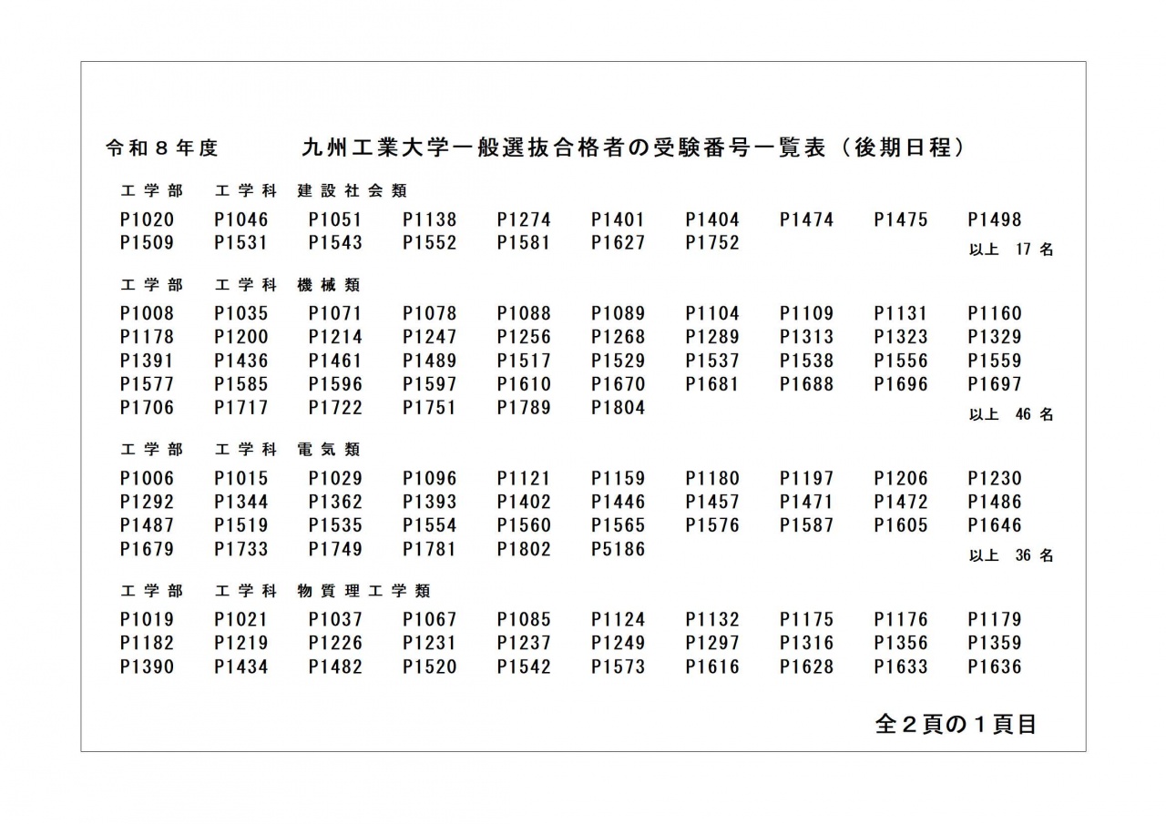 令和8年度一般選抜(後期日程)合格者発表[工学部]