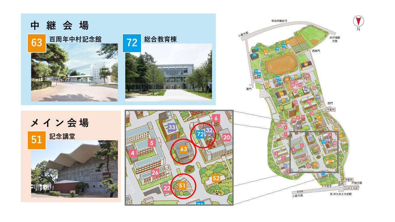 係の者の誘導により、中継会場(百周年中村記念館または、総合教育棟)にご入場下さい。