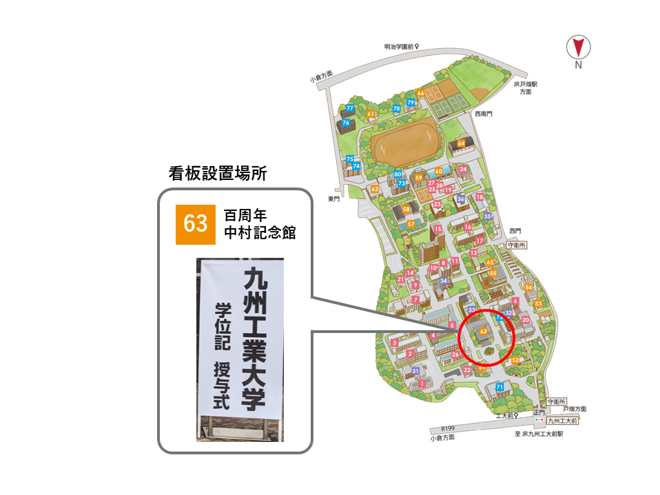 学位記授与式当日、「学位記授与式」の立て看板を次の場所に4か所、設置いたします。記念撮影等にご利用ください。