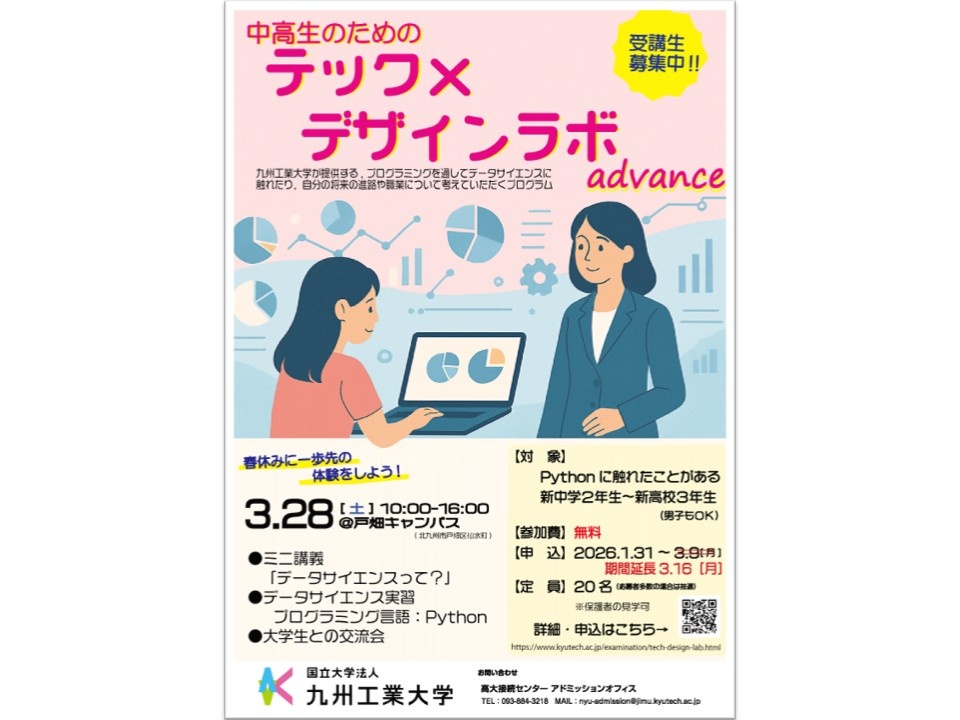 九州工業大学では、主に女子児童・生徒を対象として、進路選択や将来の仕事について考えていただくためのイベントを実施します。今回は、プログラミングを通してデータサイエンスに触れるワークショップと、大学生との交流会などを予定しています。