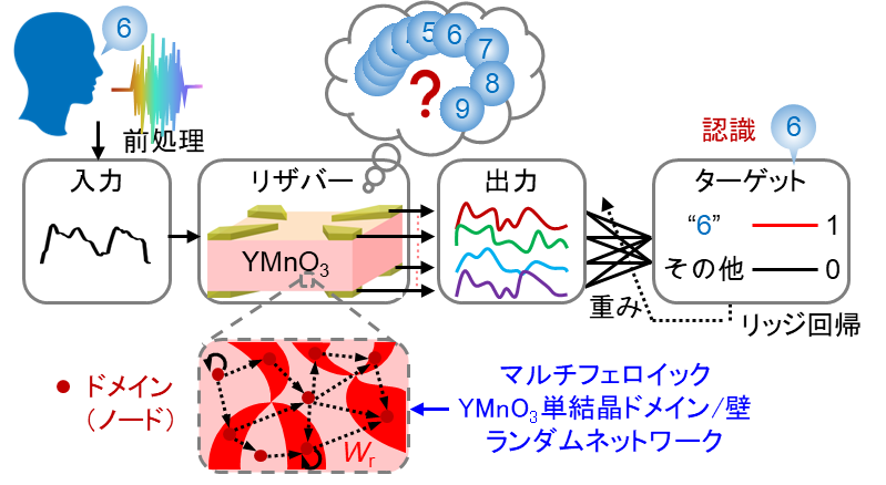AIの高度化に伴い、省エネで効率の高い計算が求められています。その一つが、音声・動作・生体信号などのリアルタイムな処理を行う、「物理リザバー計算(PRC)」で、様々な物理現象や物質の性質を利用して情報処理を行います。しかし従来の光や電気化学などによるPRCの多くは、安定性の問題や、半導体回路との統合が難しいという課題がありました。本研究では、強誘電性や反強磁性を併せ持つマルチフェロイックYMnO₃の単結晶に着目し、特別な加工を必要とせず高温でも安定に動作するという新しいPRC材料の可能性を示しました。