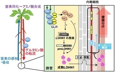 グルタミン酸(Glu)が地上部から根へのシグナル物質として機能し、LOHN1はGlu受容体GLRの活性化によって主根端の篩部細胞で発現したあと根の表層に移動し、側根形成の開始を制御する。