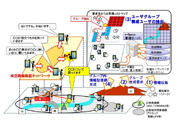 rSpace サーバは、ユーザが携行するスマートフォン等の端末と連携して、ユーザの現在位置情報や移動手段、周辺地図情報を考慮した実空間グループを作成します。ユーザが支援要請のための情報発信を行うと、適切なユーザだけが情報を受信し、直ちに発信元ユーザのもとに駆け付けることが可能であることを検証しました。(図 3 参照)