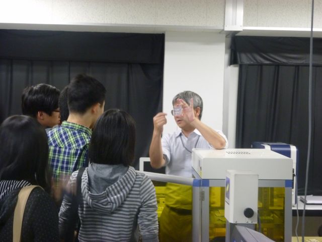 機械知能工学科系 金准教授から大学説明を行い、応用化学科 清水研究室の趙さんが大学生活について体験談を語りました。その後、一行は5グループに別れ、それぞれ機械知能工学科研究室・応用化学科研究室・白土研究室・マイクロマシン研究室・地盤工学実験室を見学されました。チョンウン高校の皆様は、本学教員からの説明を興味深く聞いていらっしゃいました。
