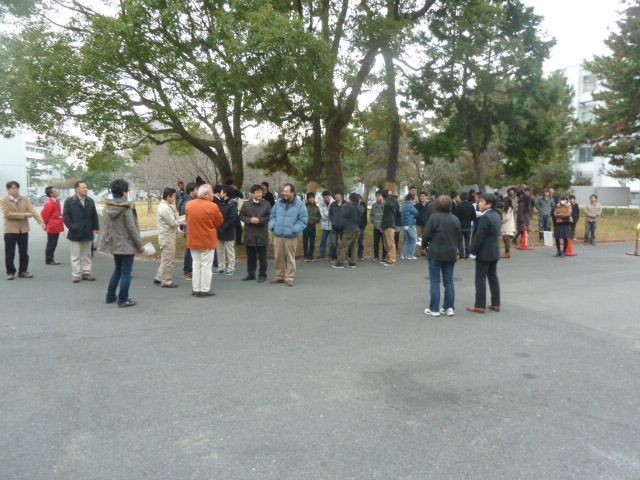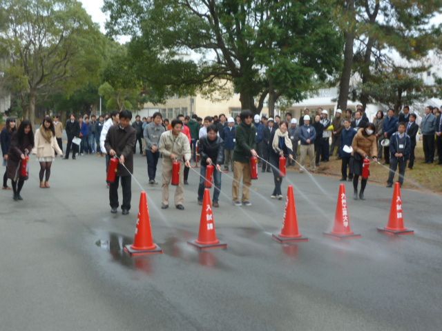 平成25年12月9日(月)本学戸畑キャンパスにおいて、戸畑消防署の指導のもと防災訓練を実施しました。 震度5強の地震発生および地震に伴う火災を想定し、教育研究6号棟を出火場所とした総合訓練(通報・避難・消火栓訓練等)と消火器操作訓練を行いました。寒冷の中、教職員・学生約80人が参加し真剣に取り組みました。 訓練後は戸畑消防署から講評を受け、参加者全員が防災に対する重要性を改めて認識することができました。