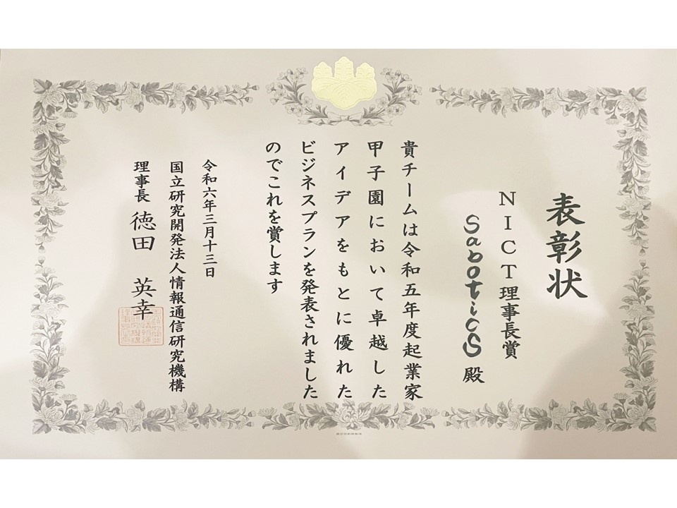 2024年3月13日、東京都の丸ビルホールで開催された令和5年度 起業家甲子園において、九工大学生チーム「Sabotics」がNICT理事長賞を受賞しました。また、パートナー企業特別賞として、NEDO賞、IOデータ賞、インフィニオン賞、セプテーニグループ賞を併せて受賞しました。
