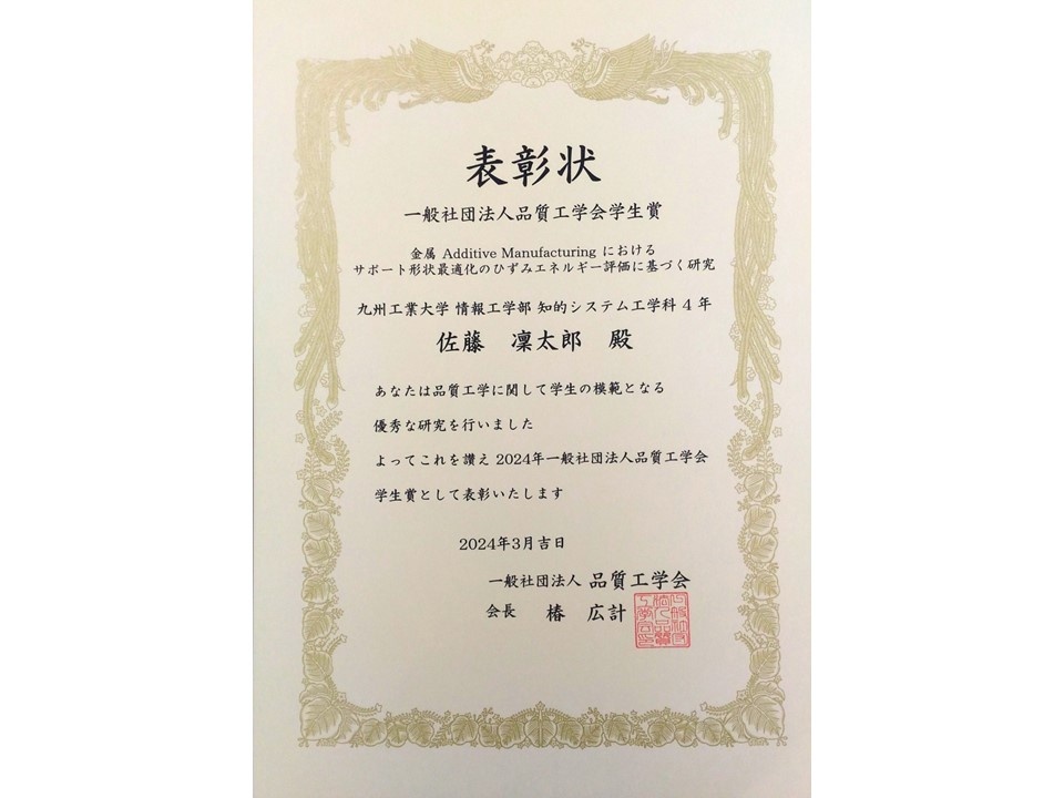 2024年3月、一般社団法人 品質工学会より、情報工学部知的システム工学科4年の佐藤凛太郎さんの卒業論文に対して、2024年一般社団法人品質工学会学生賞が授与されました。(2024年3月時点での所属・学年)