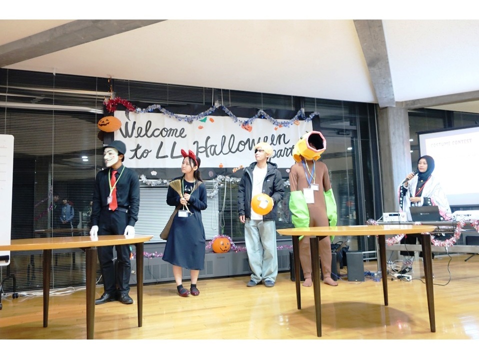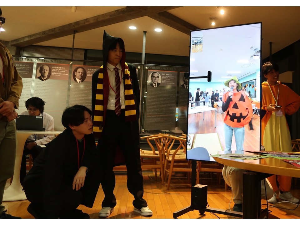 今回のイベントでは、初の試みとして、TV会議システム(MADO)を活用し、LLと飯塚キャンパスのグローバルコミュニケーションラウンジ(GCL)を接続して合同企画の仮装コンテストを行いました。両キャンパスの参加者は、「窓」に見立てた画面越しに仮装を披露し合い、合同で審査しました。その後、両キャンパスの参加者による投票で、仮装コンテストの1位・2位を決定しました。