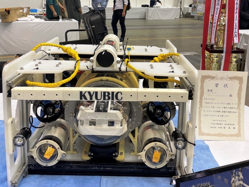 また、同イベント内で開催された「九州ロボットコンテスト2025 モノづくりフェア杯」では、九工大の学生プロジェクト「Kyutech Underwater Robotics」が、来場者による投票で第1位に選ばれ、見事優勝を果たしました。コンテストでは、各チームが制作したモノづくりに関する展示やロボットのデモンストレーションが披露され、来場者を大いに魅了しました。