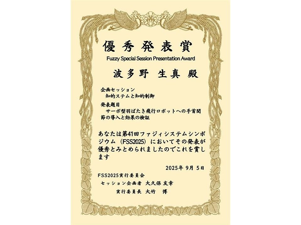 2025年9月3日~5日、くまもと県民交流館パレア(熊本市)にて、日本知能情報ファジィ学会(SOFT)主催の第41回 ファジィ システム シンポジウム(FSS2025)において、大学院情報工学府 博士前期課程 情報創成工学専攻1年の福田 涼太さんと同1年の波多野 生真さんがFSS優秀発表賞を受賞しました。