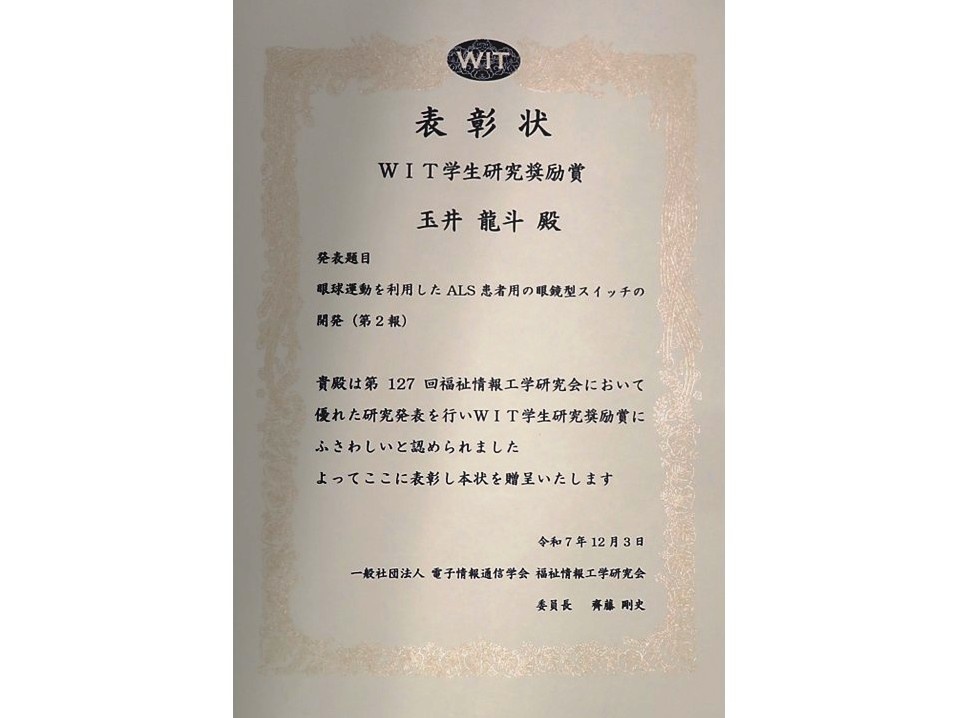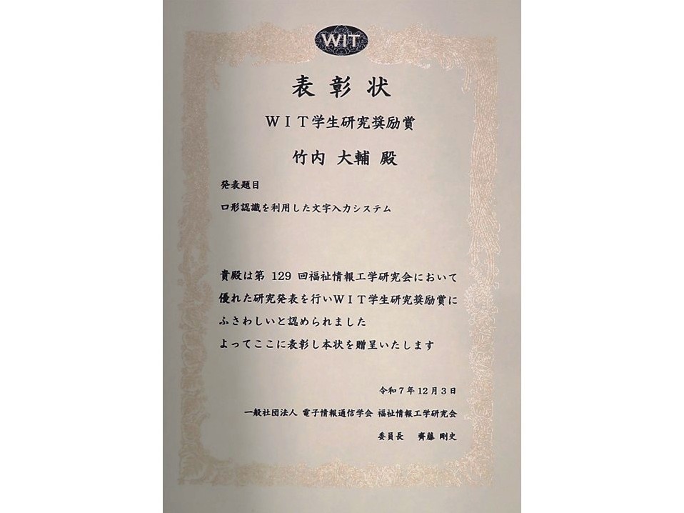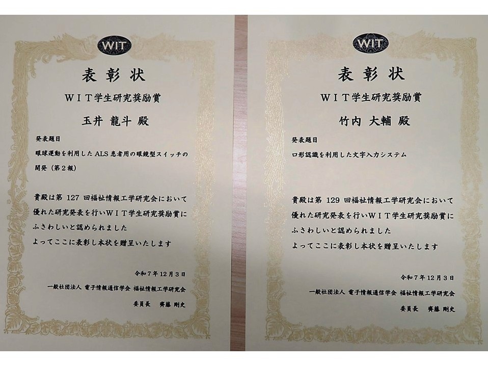 2025年12月3日、電子情報通信学会 福祉情報工学研究会(WIT)において、大学院情報工学府 博士前期課程 情報創成工学専攻 2年(※発表当時)の玉井 龍斗さんと情報工学部 知能情報工学科 4年(※発表当時)の竹内 大輔さんが、2024年度WIT学生研究奨励賞を受賞しました。