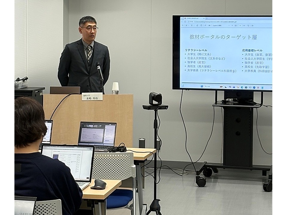 第1部では、滋賀大学データサイエンス・AIイノベーション研究推進センターの来嶋 秀治教授が登壇し「数理・データサイエンス・AI教育強化拠点コンソーシアム教材ポータルサイトの紹介」と題した講演を行いました。講演では、コンソーシアム教材ポータルサイトの概要と具体的な利活用事例が紹介されました。