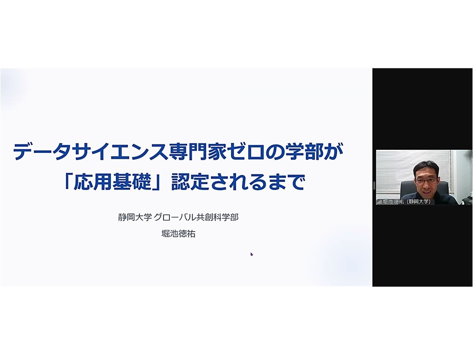 第3部では、静岡大学グローバル共創科学部の堀池 徳祐教授による「DS専門家ゼロの学部が『応用基礎』認定されるまで」と題して講演を行いました。講演では、認定取得に至るまでの具体的な取り組みや直面した課題が紹介され、今後他大学が申請を行う際に参考となる知見が共有されました。