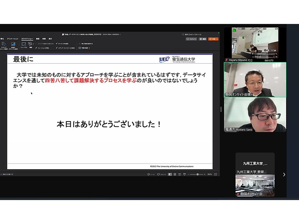 2025年12月12日、「数理・データサイエンス・AI教育強化拠点コンソーシアム」特定分野会議(自然科学系・情報科学)広報作業部会である電気通信大学、静岡大学、九州工業大学の合同主催で「コンソーシアム教材の利活用をテーマとしたシンポジウム」を開催しました。全国の大学、高等専門学校、省庁、企業から計75人が参加し、3大学のオンサイト会場とオンラインを組み合わせたハイブリッド形式で行われました。