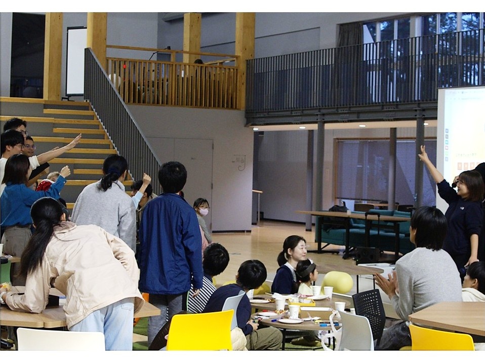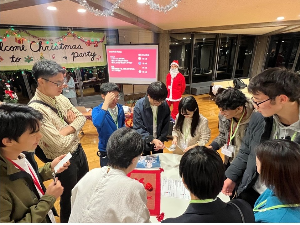 第2部は、会場をLLに移して開催しました。オープントークの後、参加者同士が協力して「CHRISTMAS」の9文字を集めてチームを作るチームビルディングゲームを行いました。続いて、スプーンで雪玉を隣の人へリレーし、最後の人がゴールに入れた得点を競い合う「スノーボールリレーゲーム」を実施しました。制限時間内に最も高い得点を獲得したチームが勝利するルールで、チーム内のコミュニケーションを促進する内容となり、参加者からは「とても楽しかった」との声が寄せられました。その後のフリータイムでは、参加者がクリスマスツリーの飾り付けを制作したり、ボードゲームを楽しみながらピザを囲んで交流を深めました。