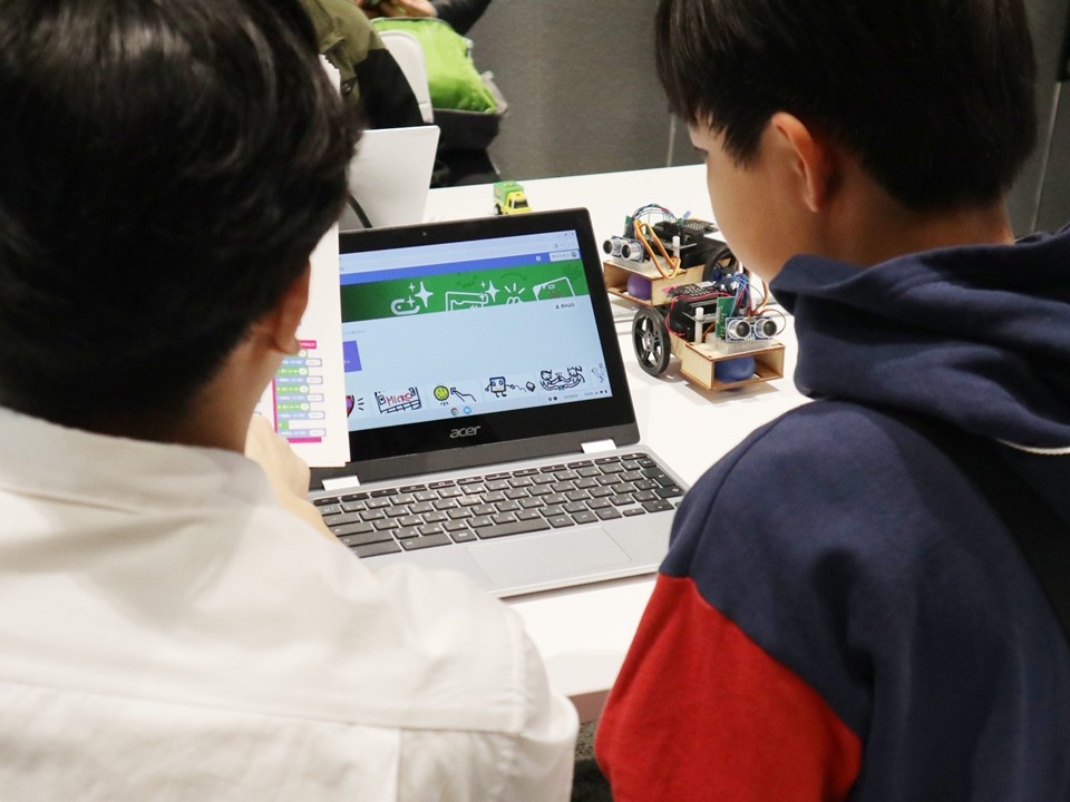 12月20日、小学4年生から中学生を対象に、「プログラマーのお仕事」をテーマとした体験プログラムを実施しました。参加者は、先輩プログラマー役の学生TAの指導を受けながら、ロボットカーが障害物を回避して目的地まで走行するためのプログラム仕様書を作成しました。その後、micro:bitを用いて、試行錯誤を重ねながらプログラミングに取り組みました。完成した仕様書は上司役の九工大職員に提出し、確認印を受けた後、仕事の報酬として、会場内の指定場所で使用できる「モビ」が手渡され、仕事体験を終えました。本プログラムでは、技術部が教育用教材として開発した手作りロボットカーを使用しました。