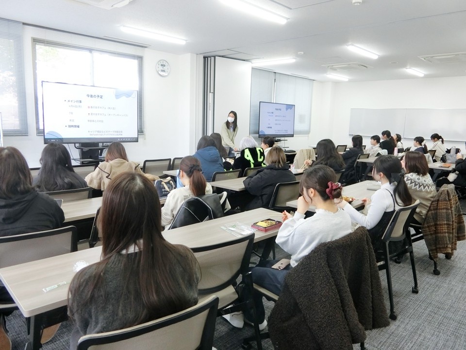 ランチ会の冒頭では、SheTech代表が団体設立の趣旨や今後取り組んでいきたい活動について紹介しました。その中で、来年度に入学予定の女性新入学生を対象とした「新入生交流会」について話題が集まりました。「どのような雰囲気であれば参加しやすいか」「先輩としてどのようなサポートができるか」といった点をテーマに、司会進行やプログラム内容について意見交換が行われ、具体的なアイデアが数多く挙げられました。情報工学部では、来年度入学予定の女性学生が安心して楽しく大学生活をスタートできるよう、「SheTech」のメンバーを中心に準備を進めています。