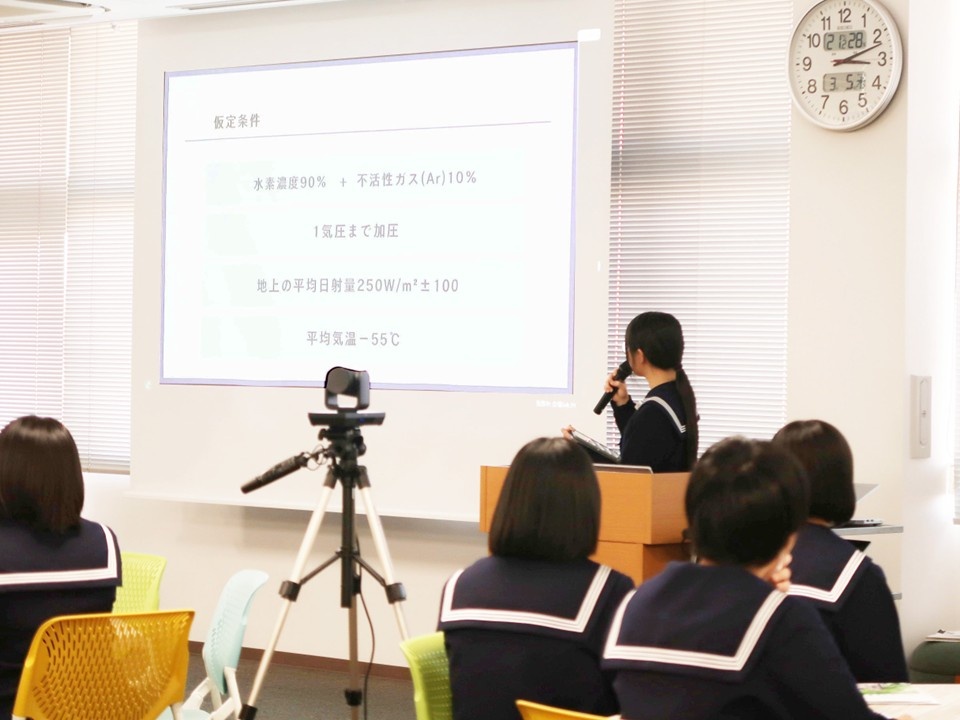 この探究活動発表会は、これまでの探究活動を通して、生徒の皆さんが高校生活の中で行ってきた調査・研究の成果を発表するものです。発表は、サイエンスコースを選択している生徒の皆さんの中から選ばれた4名により、次の題目で行われました。