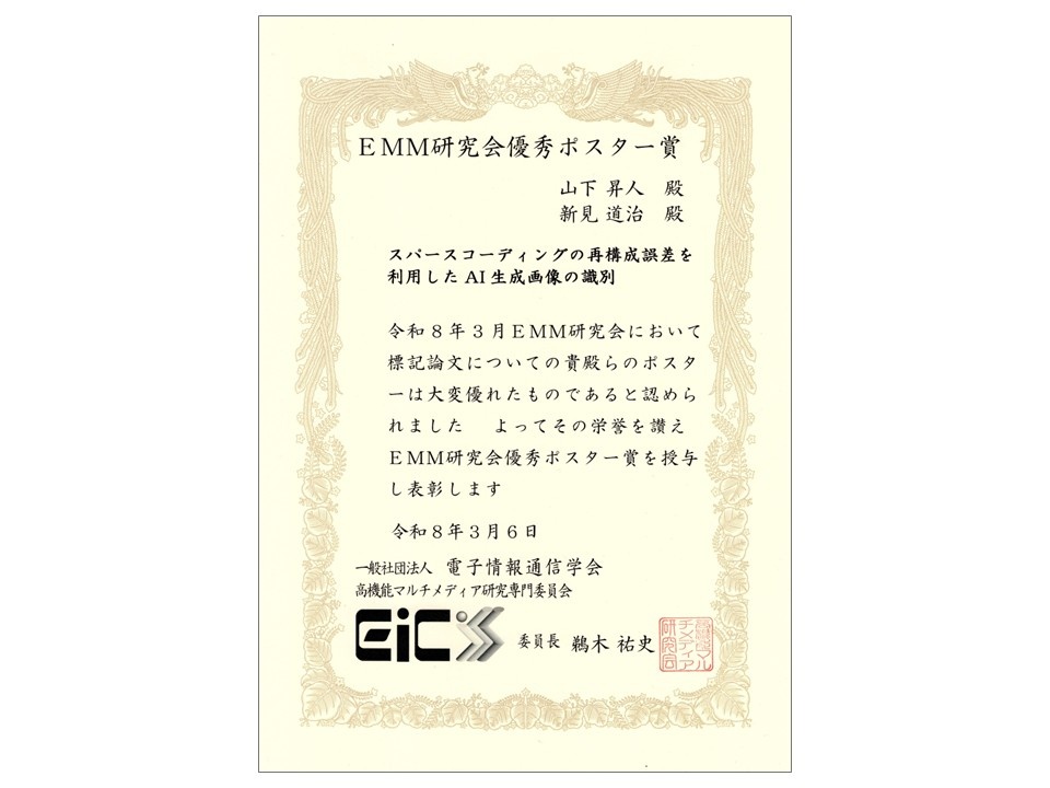 | 発表題目 | スパースコーディングの再構成誤差を利用したAI生成画像の識別 |