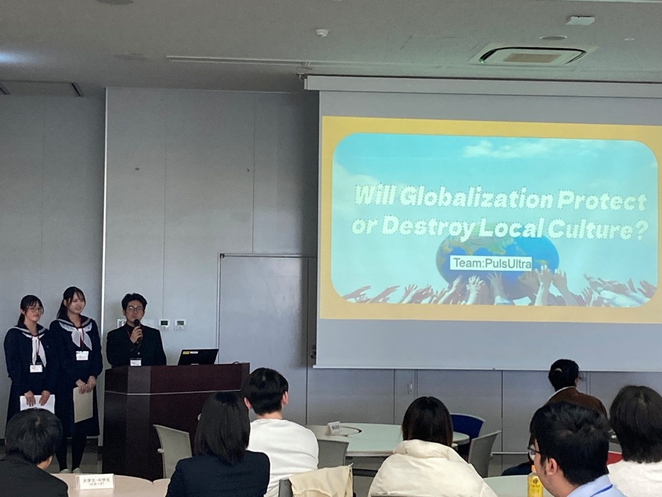 当日は、九工大学生11名とAPU学生7名の計18名の大学生がサポート役として参加しました。発表に向けたプレゼンテーションや英語表現の指導、グループワークにおける意見交換、さらにはこれからの高校生活や国際社会で求められる姿勢についてアドバイスを行いました。