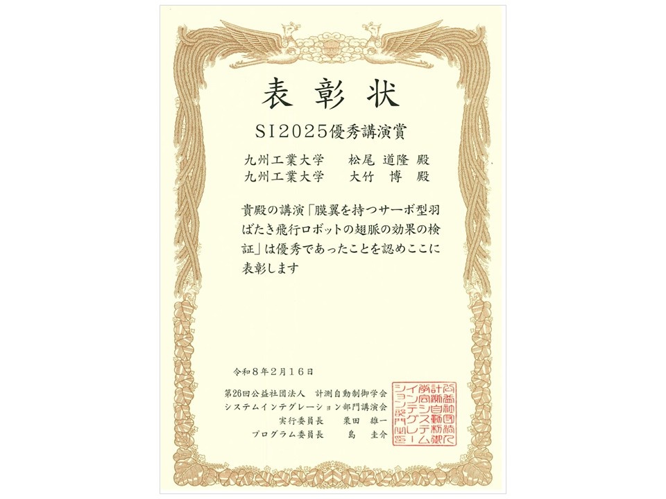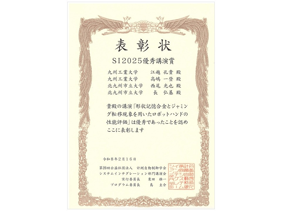 2025年12月10日~12日、広島国際会議場において、第26回計測自動制御学会システムインテグレーション部門講演会(SI2025)が開催され、本学学生および教員らが下記のとおりSI2025優秀講演賞を受賞しました。本賞はSI2025において優秀な発表を行った研究者に授与されるものです。