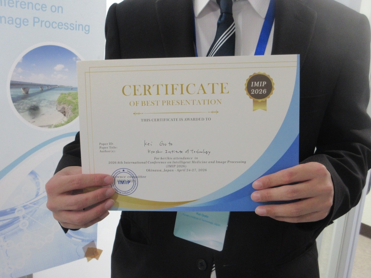 2026年4月24日~27日、琉球大学において、国際会議 2026 8th International Conference on Intelligent Medicine and Image Processing (IMIP 2026) が開催され、大学院情報工学府博士前期課程2年の後藤慧さんが研究発表を行いBest Presentation 賞を受賞しました。本研究は、大学院情報工学研究院知能情報工学研究系の平田 耕一教授、ケーディーアイコンズ株式会社の横山 茂樹氏、医療法人弘仁会 南和病院の松岡喜美子氏との共同研究です。