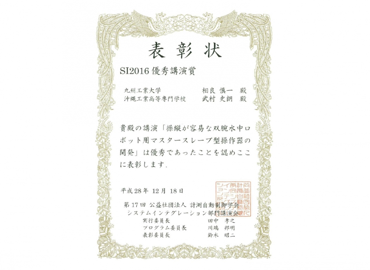 平成28年年12月15日(木)~17日(土)の期間、札幌コンベンションセンターにて開催された、第17回計測自動制御学会システムインテグレーション部門講演会(SI2016)において、本学教員が優秀講演賞を受賞しました。 【優秀講演賞】 受賞者: 相良 慎一 教授 (九州工業大学 大学院工学研究院 機械知能工学研究系) 武村 史朗 准教授 (沖縄工業高等専門学校 機械システム工学科) 講演タイトル: 操縦が容易な双腕水中ロボット用マスタースレーブ型操作器の開発