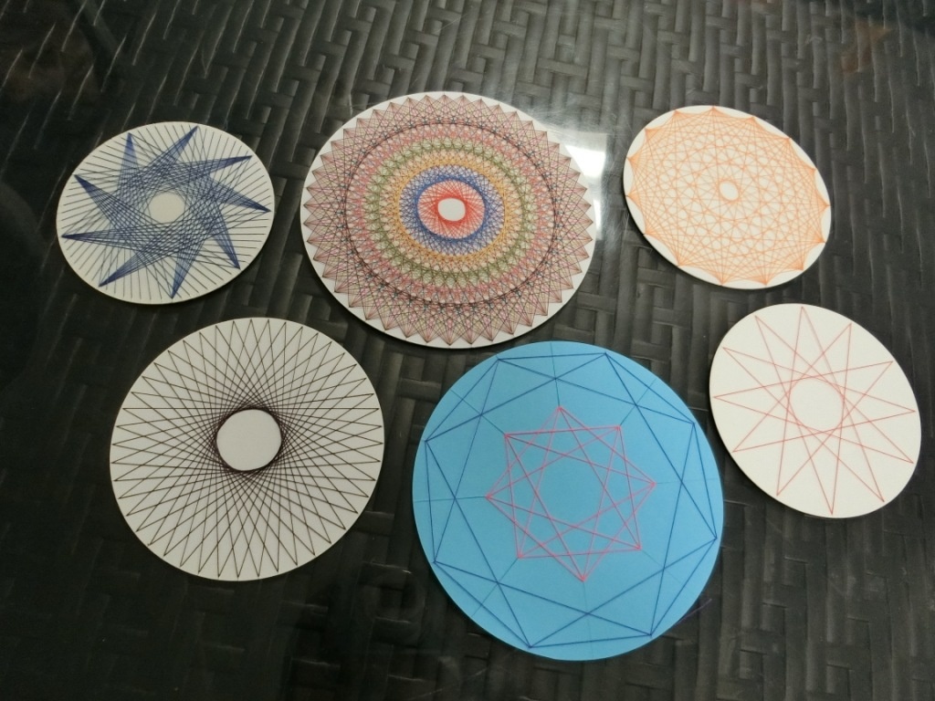 正多角形の頂点を規則的に結んでいくとポアンソの星と呼ばれる様々な星の形ができあがります。今回は基本の星型模様を糸で描いてみた後、星型図形について学習し、それぞれ工夫しながら色々な模様を描いていきました。