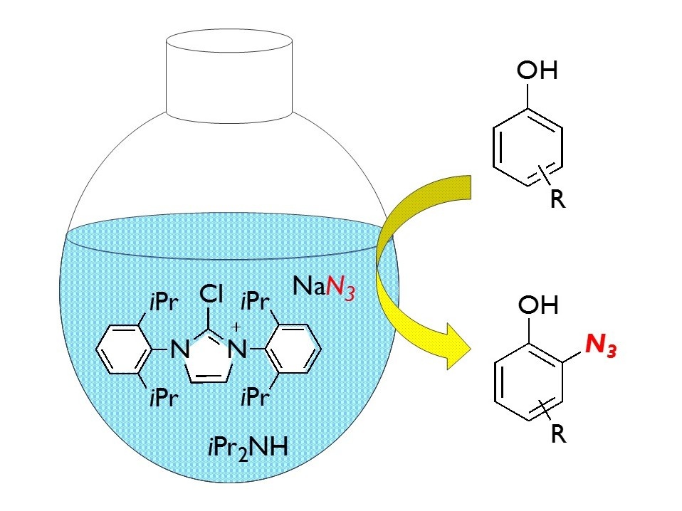 近年特に、有機アジド化合物は、生物化学や創薬化学の分野において不可欠な化合物となり、合成法の開発が望まれています。これまで、芳香族化合物を直接アジド化する手法はありませんでしたが、北村教授らのグループは、フェノール類に直接アジド化を行う手法を開発しました。