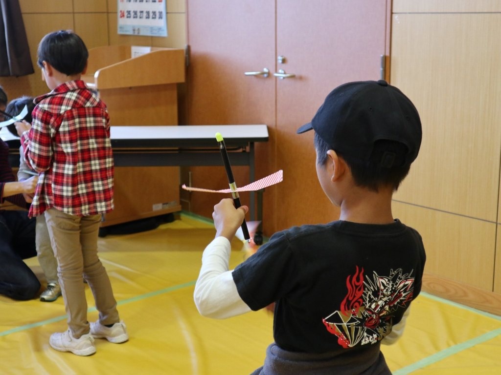 プロペラ(回転翼:ローター)の原理・技術やヘリコプターが飛ぶ仕組みについてレクチャーを受けた後、参加者は職員や学生TAのアドバイスを受けながら、「ロケット型ヘリコプター」を制作しました。プロペラ(ローター)を回しゴムを巻き上げて手を離すと、機体がぐんぐん上昇し、参加者は何度も挑戦して楽しんでいました。