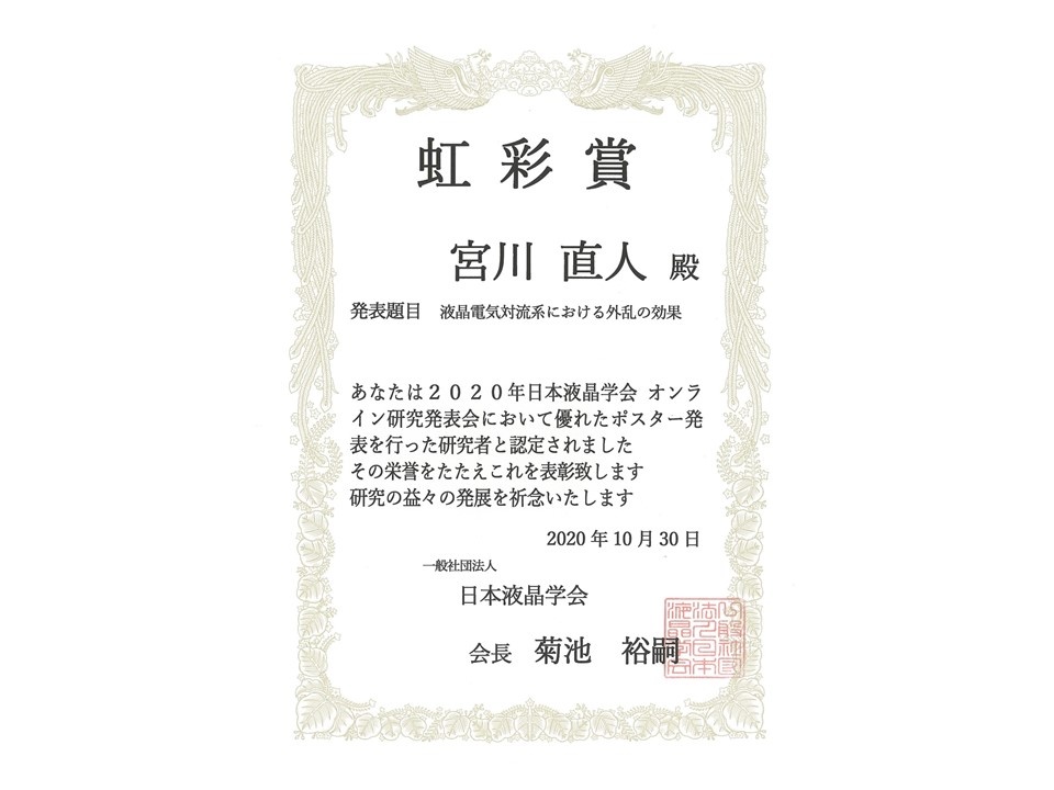 2020年10月29日~30日、2020年日本液晶学会オンライン研究発表会が開催され、本学大学院情報工学府 学際情報工学専攻 博士前期課程2年の宮川直人さんが『液晶電気対流系における外乱の効果』と題して研究発表を行い、虹彩賞(英語名称:JLCS Kousai Poster Award)を受賞しました。