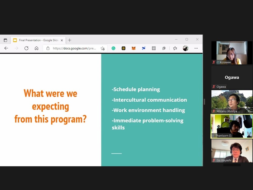 毎週Zoomなどを利用し、競技会や最終発表会に向けてロボット製作に取り組みました。言語の壁やバックグラウンドが異なりながらも、タイと日本の学生は意見を出し合い、取り組んでいたのでお互いに刺激となり、異文化交流ができる有意義な活動となりました。